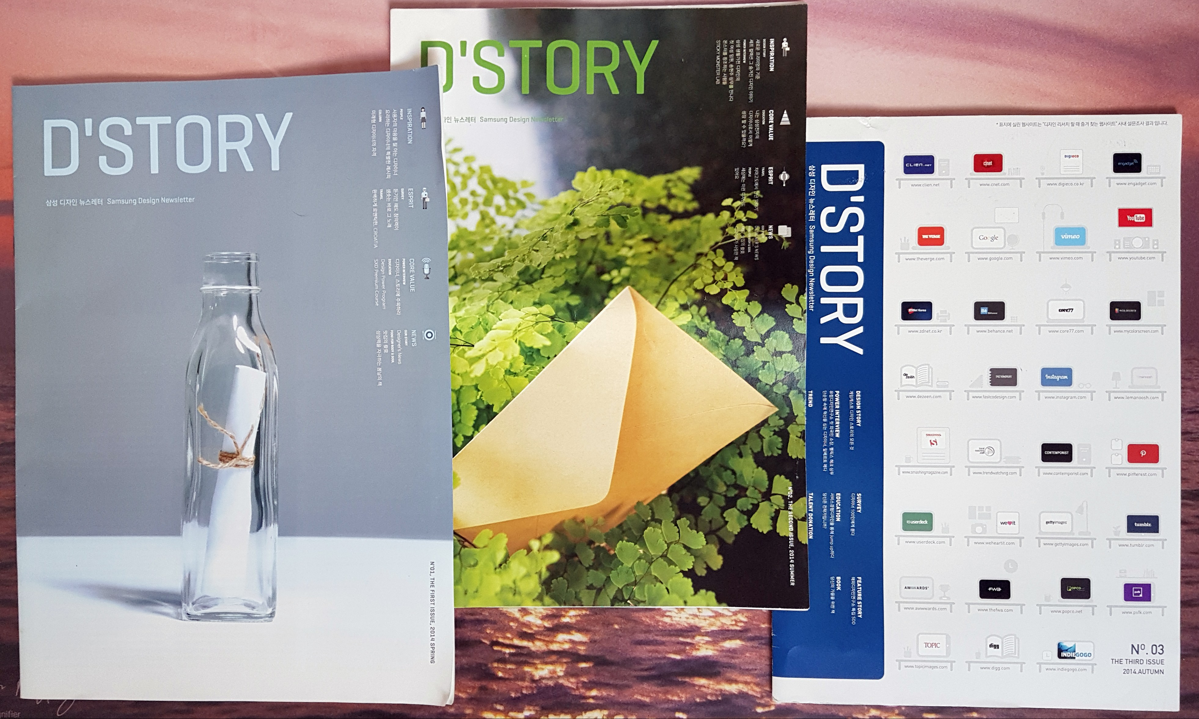 D-Story is a quarterly magazine in which Samsung designers share news from Samsung Design along with their perspectives. The first print version of D-Story was released in March 2014, with three writers, each representing one of the following: the mobile division, the consumer electronics division, and the printing division. The print version has ceased publication, and news from Samsung Design is now delivered only online.